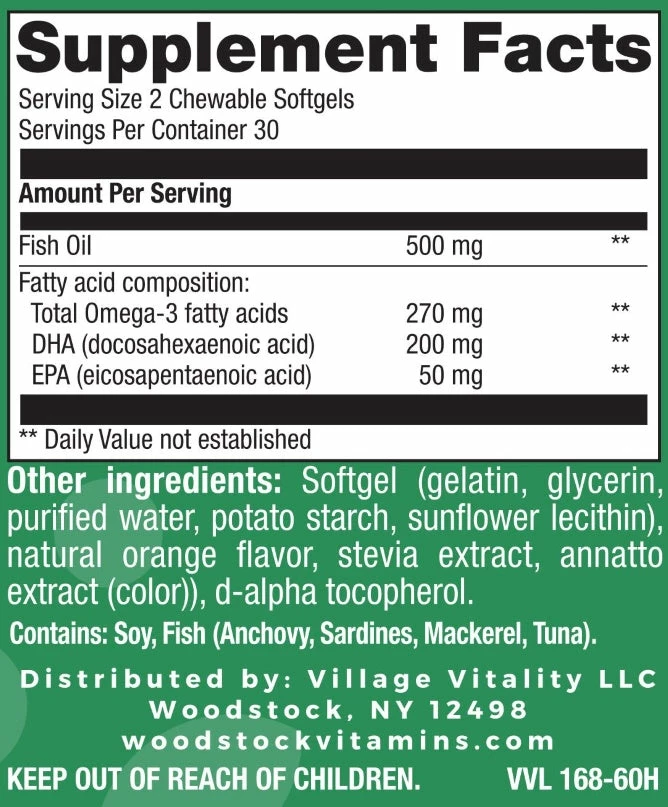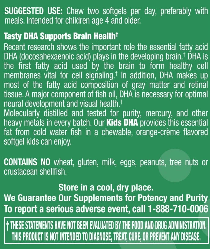 Molecularly distilled and tested for mercury, PCBs, dioxins, and heavy metals in every batch, Woodstock Vitamins Kids DHA provides this essential fat from cold-water fish in a chewable natural orange-creme flavored Softgel kids can enjoy.