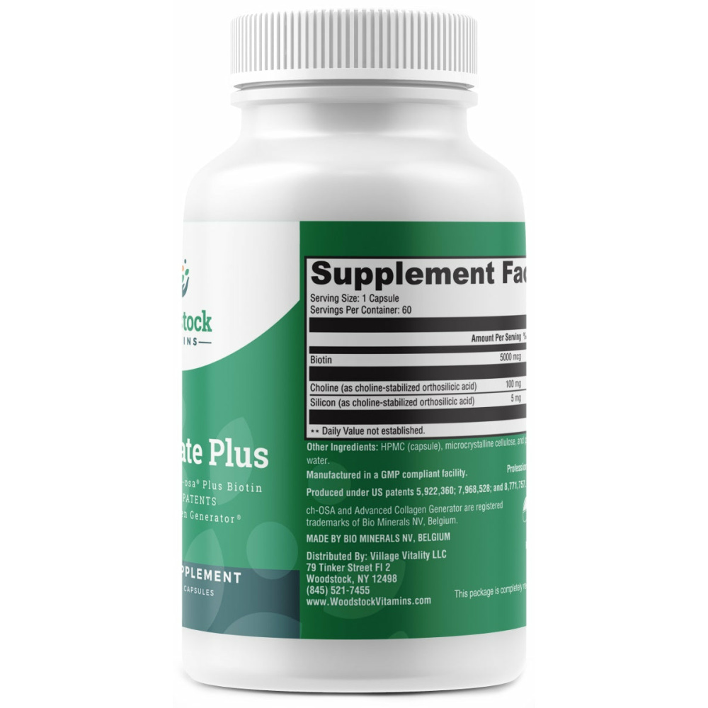 Regenerate Plus is a biotin supplement that combines choline-stabilized orthosilicic acid (ch-OSA) with critical nutrient choline. This combination enhances the bioavailability and uptake of silica, supporting healthy skin, hair, nails, and bones. Choline aids in transporting silica across the blood-brain barrier, making the supplement more effective.